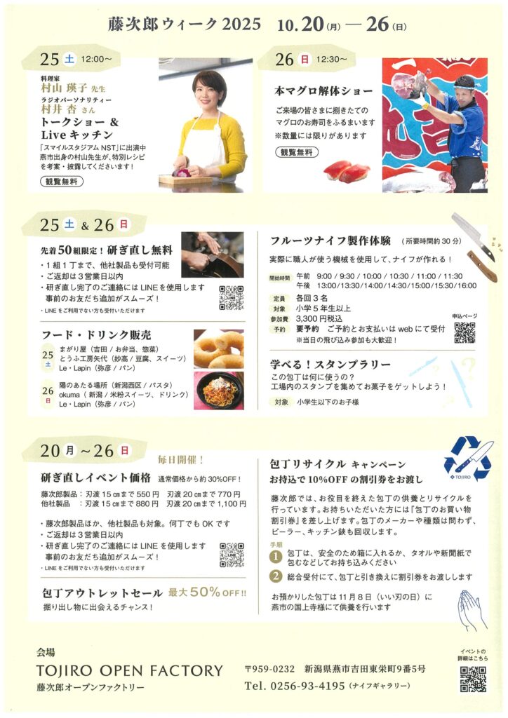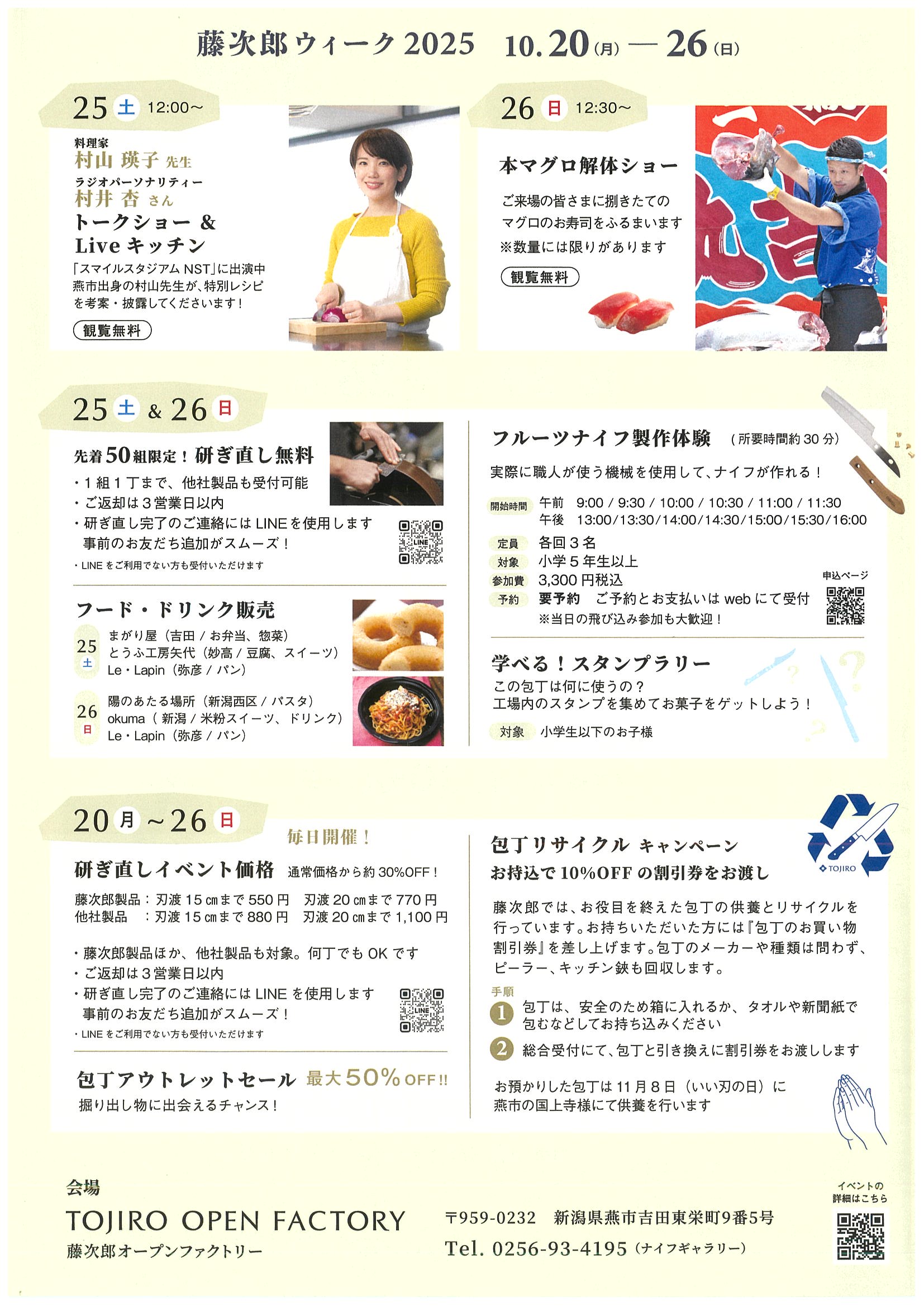 人気の包丁研ぎ直しに加え、25日(土)・26日(日)はトークショーや体験イベントなど、ご家族で楽しめる企画が目白押しです。