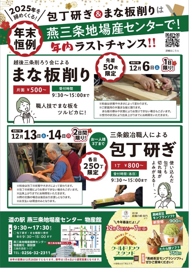 道の駅燕三条地場産センターでは、「まな板削り」と「包丁研ぎ」が開催されます。