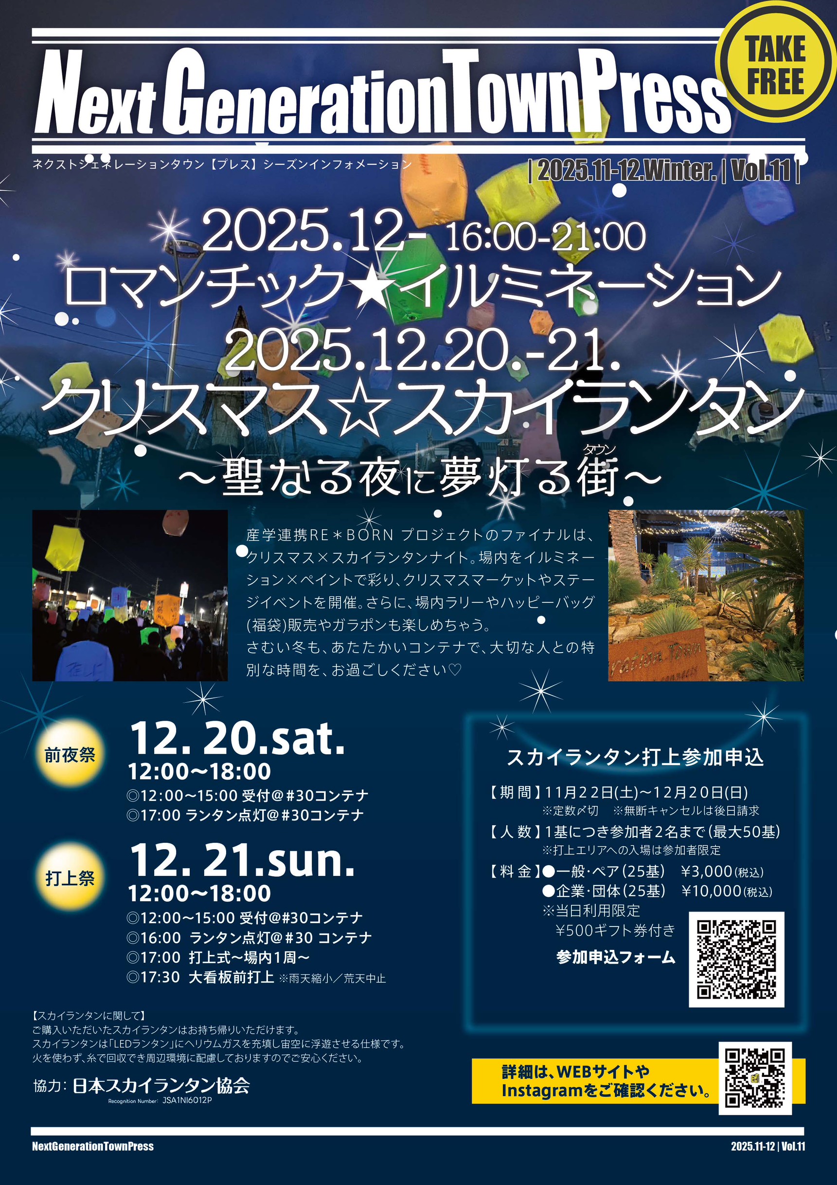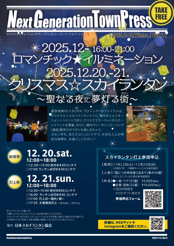 Next Generation Townは今年、燕市まちなかにぎわい創出補助事業として、県内クリエーターやデザイン専攻の学生、地域のみなさんと一緒に、場内装飾や演出をパワーアップさせるイベントを、年内で企画しました。今回はそのプロジェクトのファイナルイベントとなる【2025クリスマス★スカイランタン】をご案内いたします。