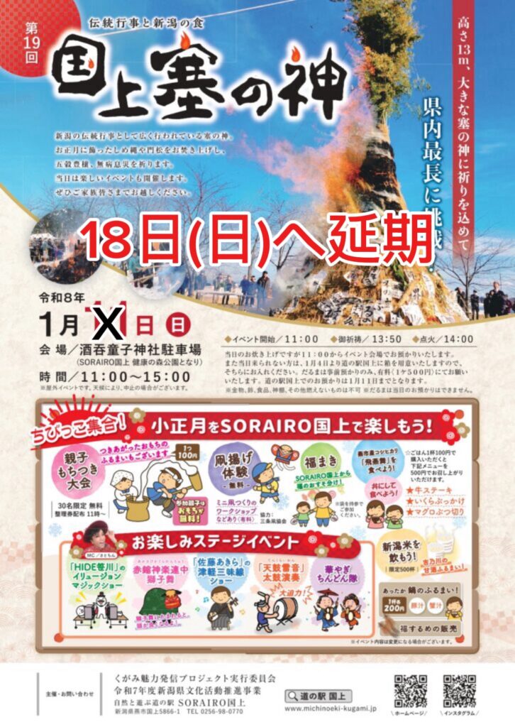 1月11日(日曜日)に開催を予定しておりました「第19回 国上塞の神」について、当日荒天・暴風雪が予報されていることに伴い、1月18日(日曜日)への延期を主催者により決定されましたので、お知らせします。