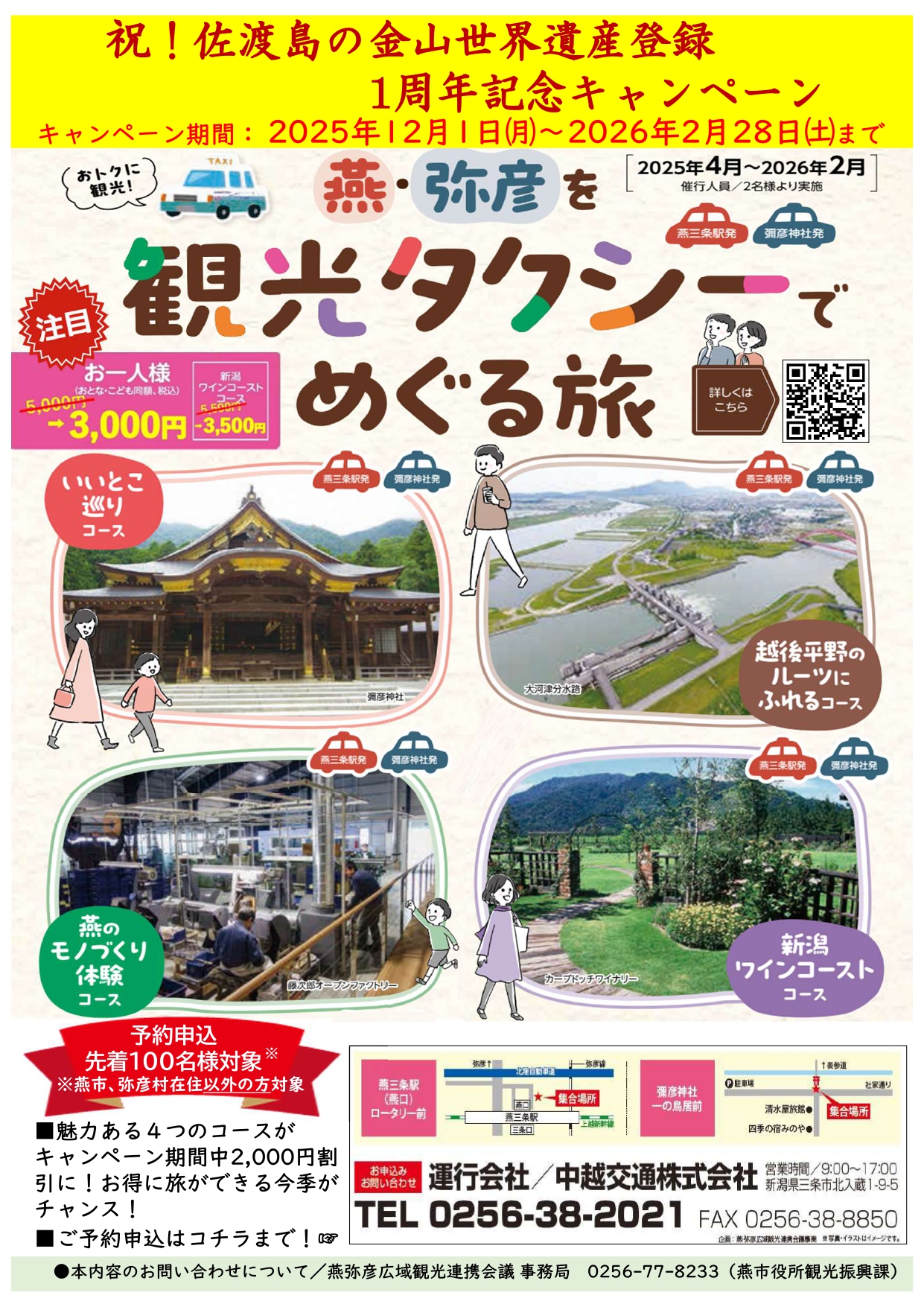 キャンペーン期間中「いいとこ巡りコース」、「越後平野のルーツにふれるコース」、「燕のモノづくり体験コース」、「新潟ワインコーストコース」のいずれかのコースを、予約の方先着 100 名様に限り 2,000 円割引いたします。