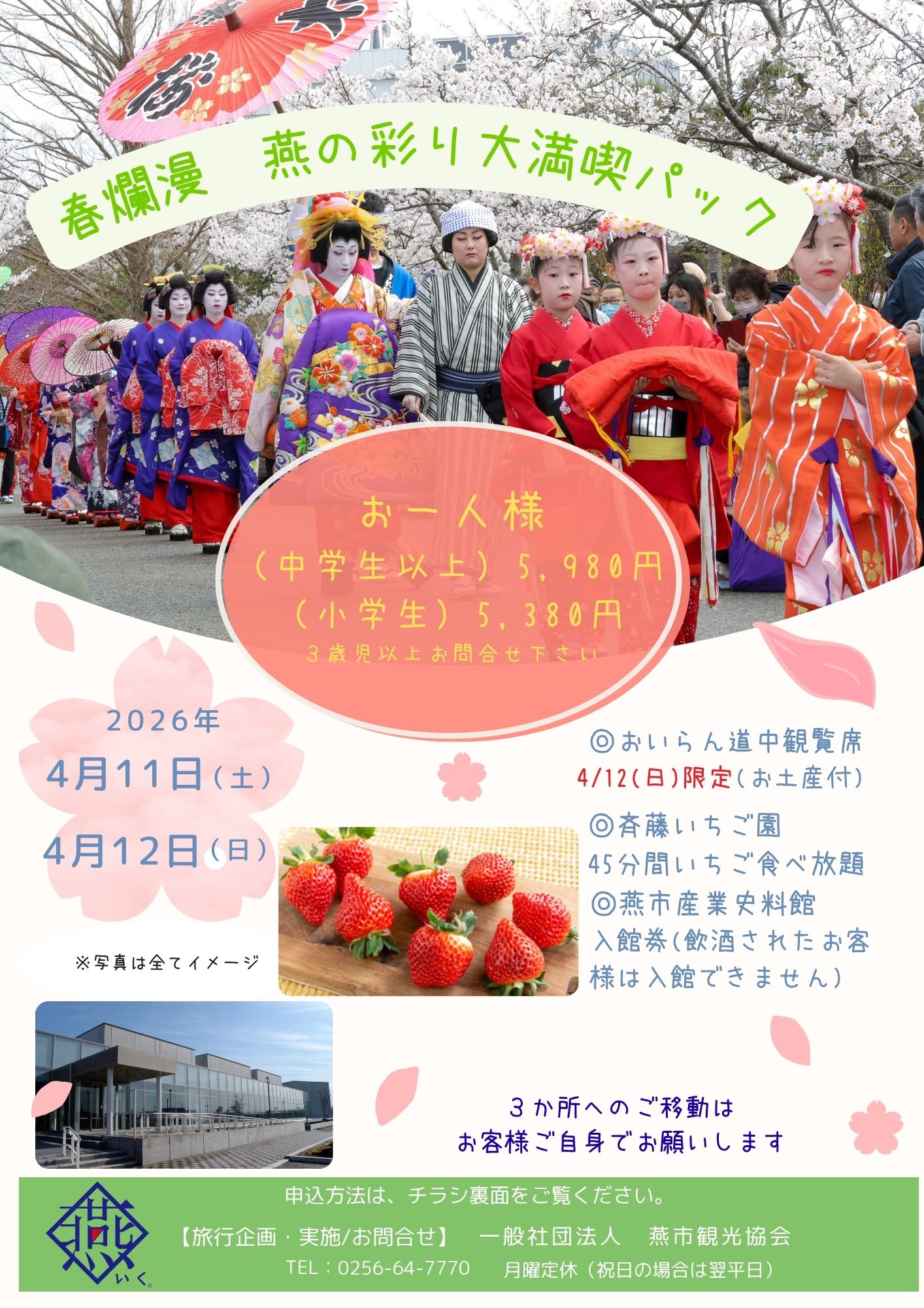 燕の春といえば、絢爛豪華な分水おいらん道中。さくら舞い散る中で、ゆったりと観覧席から観覧してみませんか。そして、希少ないちご「越後姫」を45分間食べ放題!その後、燕市産業史料館で燕の歴史を学ぶ。ものづくり体験も各種ご用意(体験料別途)しております。どこから先に行かれてもOK!お好きなところからご見学・体験ください。