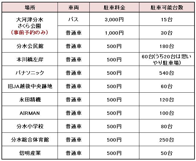 ※バスでお越しの方のうち、予約がなくても大河津分水さくら公園駐車場に空きがあればご利用いただくことが可能です。